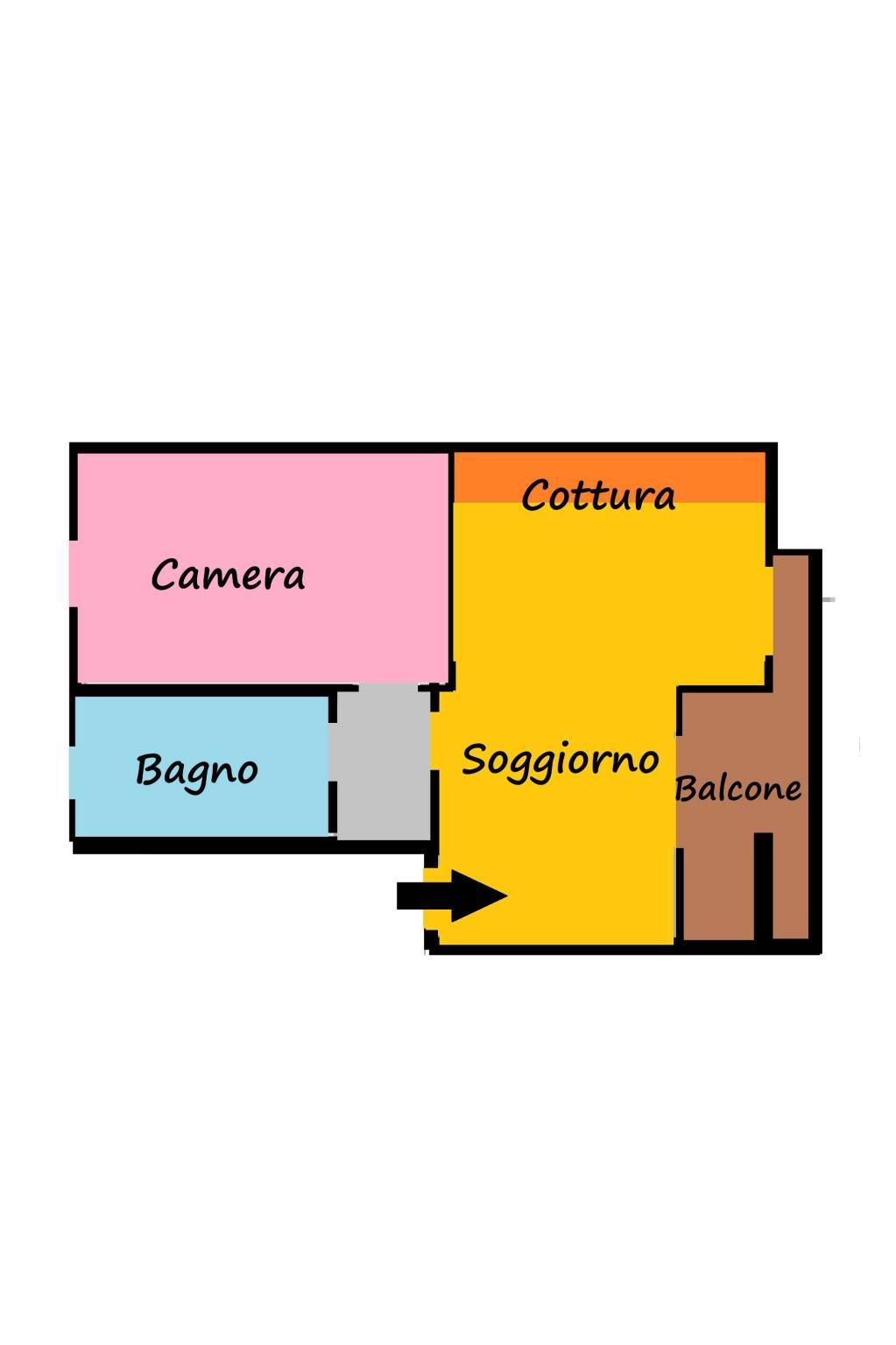 L'appartamento al piano primo è servito da ascensore ed è cosi composto e distribuito : l'ingresso accede direttamente alla zona soggiorno cottura ,servita e valorizzata da un comodo balconcino. La zona notte ospita un disimpegno , un bagno finestrato ed una camera da letto .